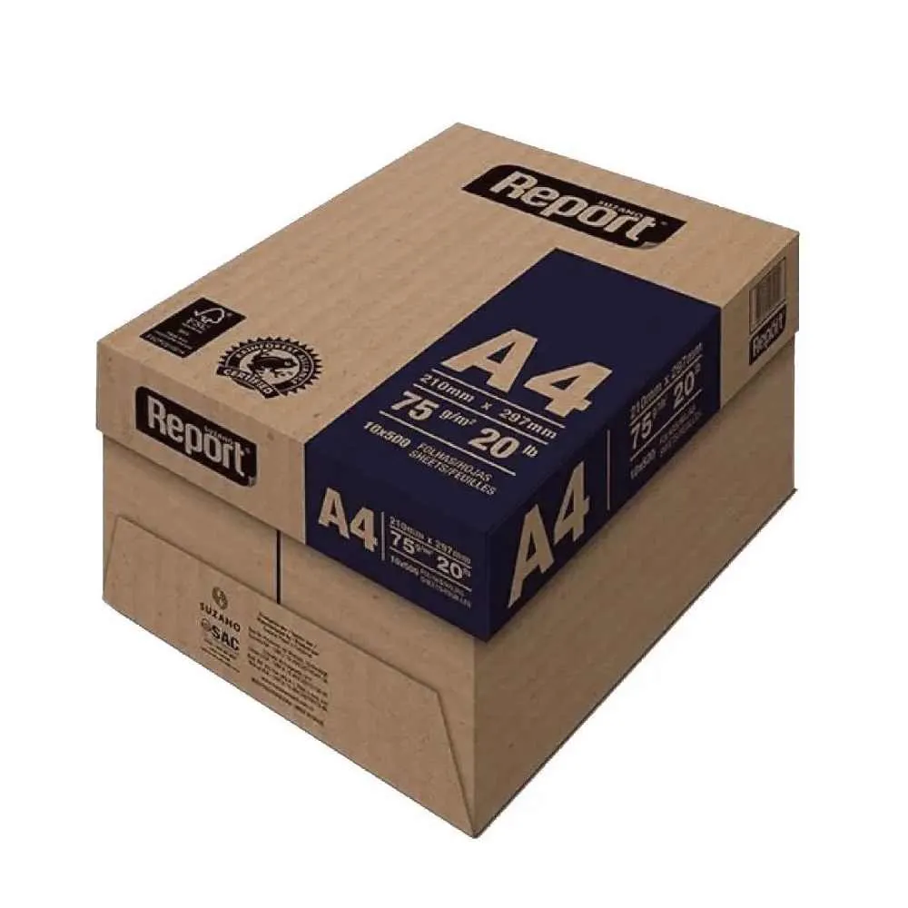 A caixa de papel sulfite A4 Report traz 5.000 folhas no total (10 × 500), com gramatura de 75 g/m², formato padrão 210 × 297 mm. Produzido pela Suzano, este papel oferece boa opacidade, ótimo rendimento em impressoras jato de tinta, laser e fotocopiadoras, e secagem rápida, evitando borrões.
